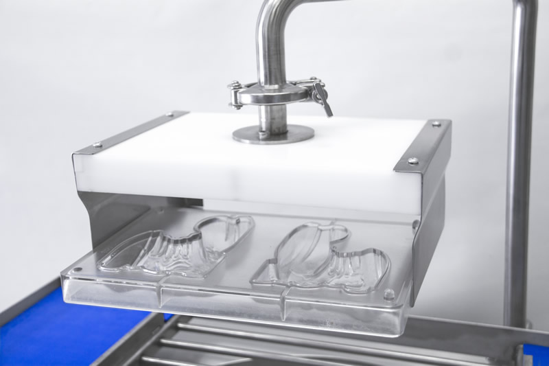 This chocolate depositing head can be fitted to any INFINITY Series machine and is supplied with one depositing plate custom-made to suit any mould specified by you. It is suitable for use with standard polycarbonate moulds measuring either 275 x 135 mm or 275 x 175 mm.